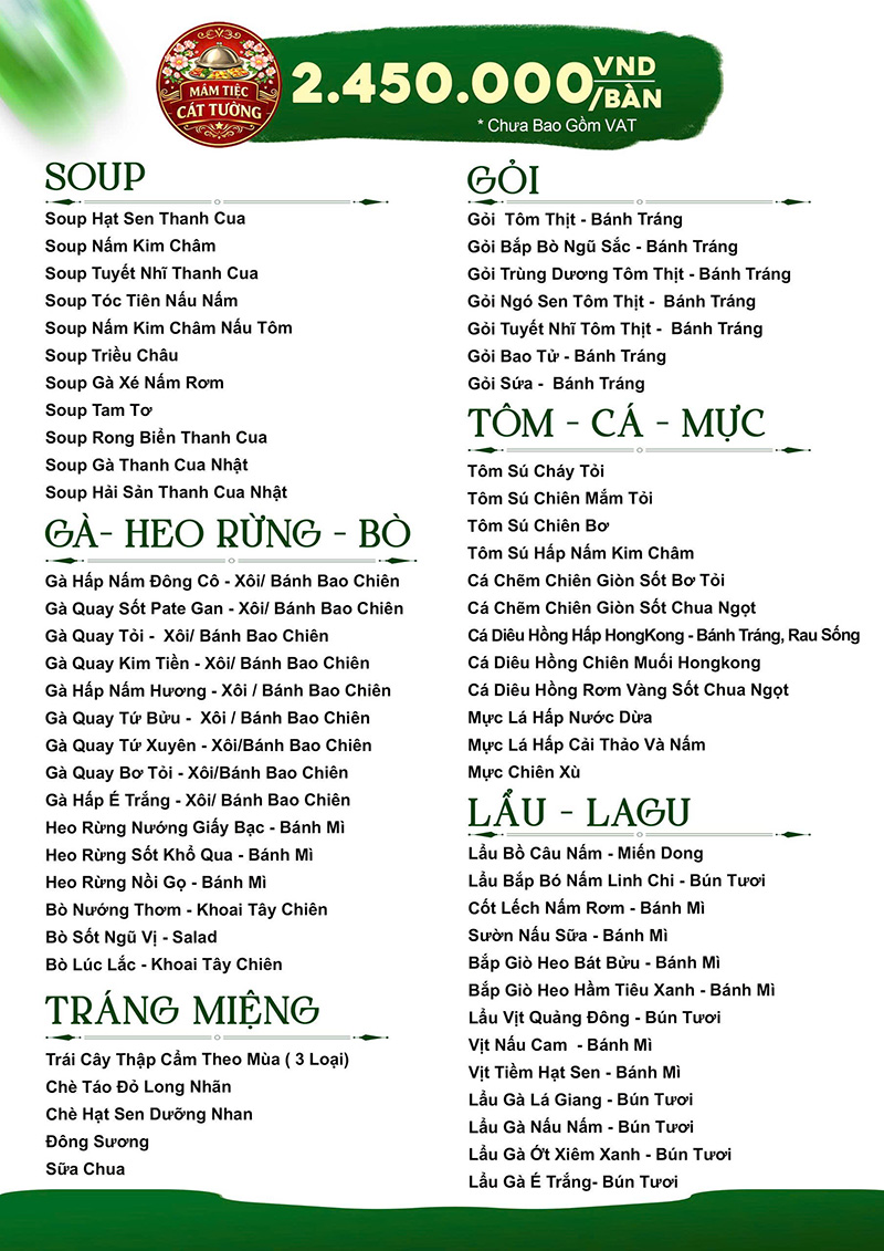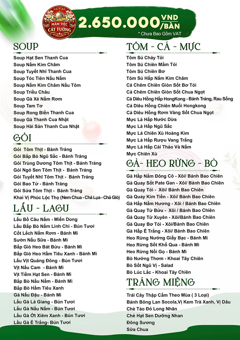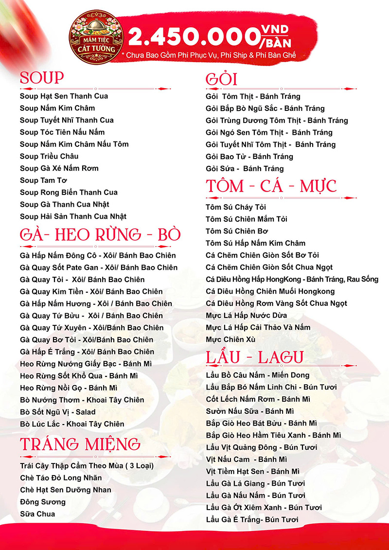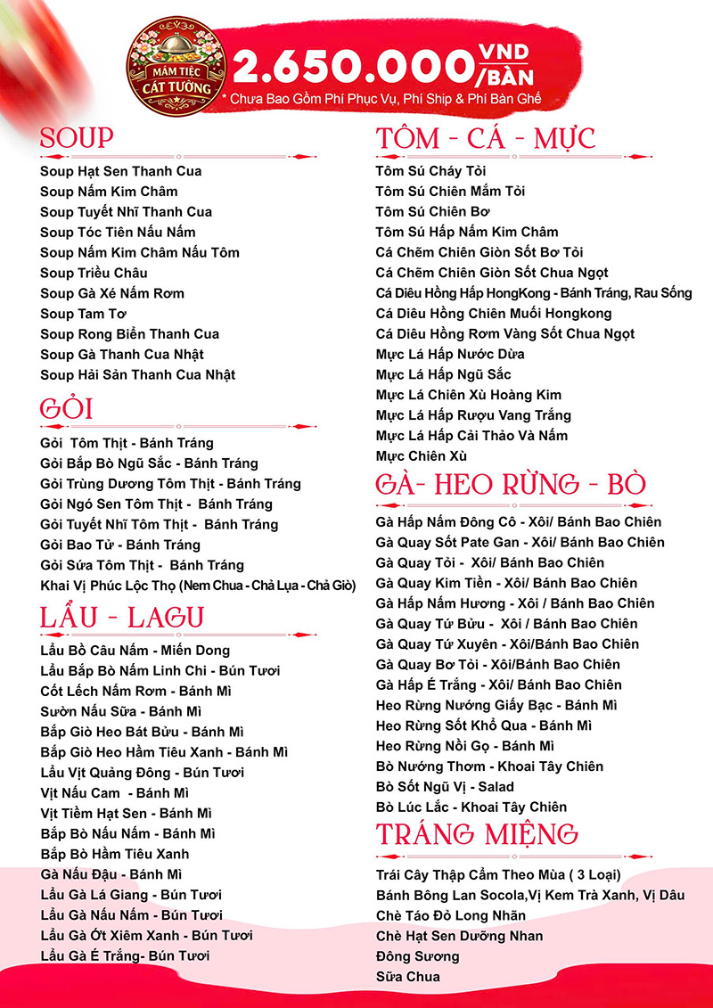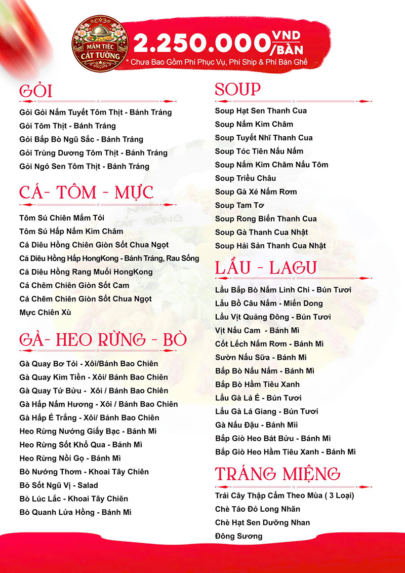 Đến với Mâm Tiệc Cát Tường, quý khách sẽ được trải nghiệm tiệc trọn gói với quy trình phục vụ tiệc từ A – Z. Mâm Tiệc Cát Tường chuyên nhận tổ chức các loại tiệc như: tiệc tân gia, tiệc đầy tháng, tiệc mừng thọ, tiệc sinh nhật, tiệc đám cưới, tiệc thôi nôi,…tiệc buffet, tiệc BBQ. Với các thực đơn đãi tiệc đa dạng.