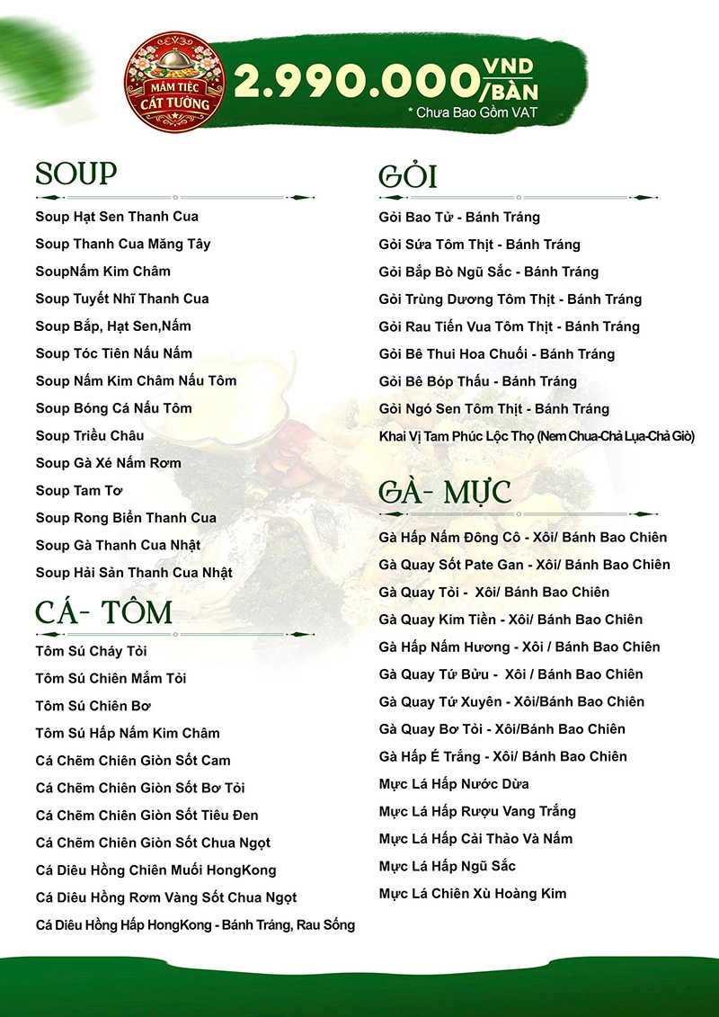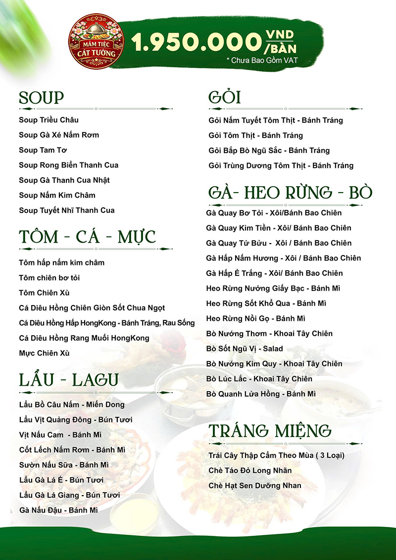 Hiện tại Mâm Tiệc Cát Tường có đến 38 bộ thực đơn đặt tiệc tại nhà và hơn 200 món ăn khác nhau mang nét đặc trưng của từng vùng miền Việt Nam. Đảm bảo quý khách sẽ chọn được thực đơn phù hợp với bữa tiệc tại nhà, gia đình hoặc công ty của mình.